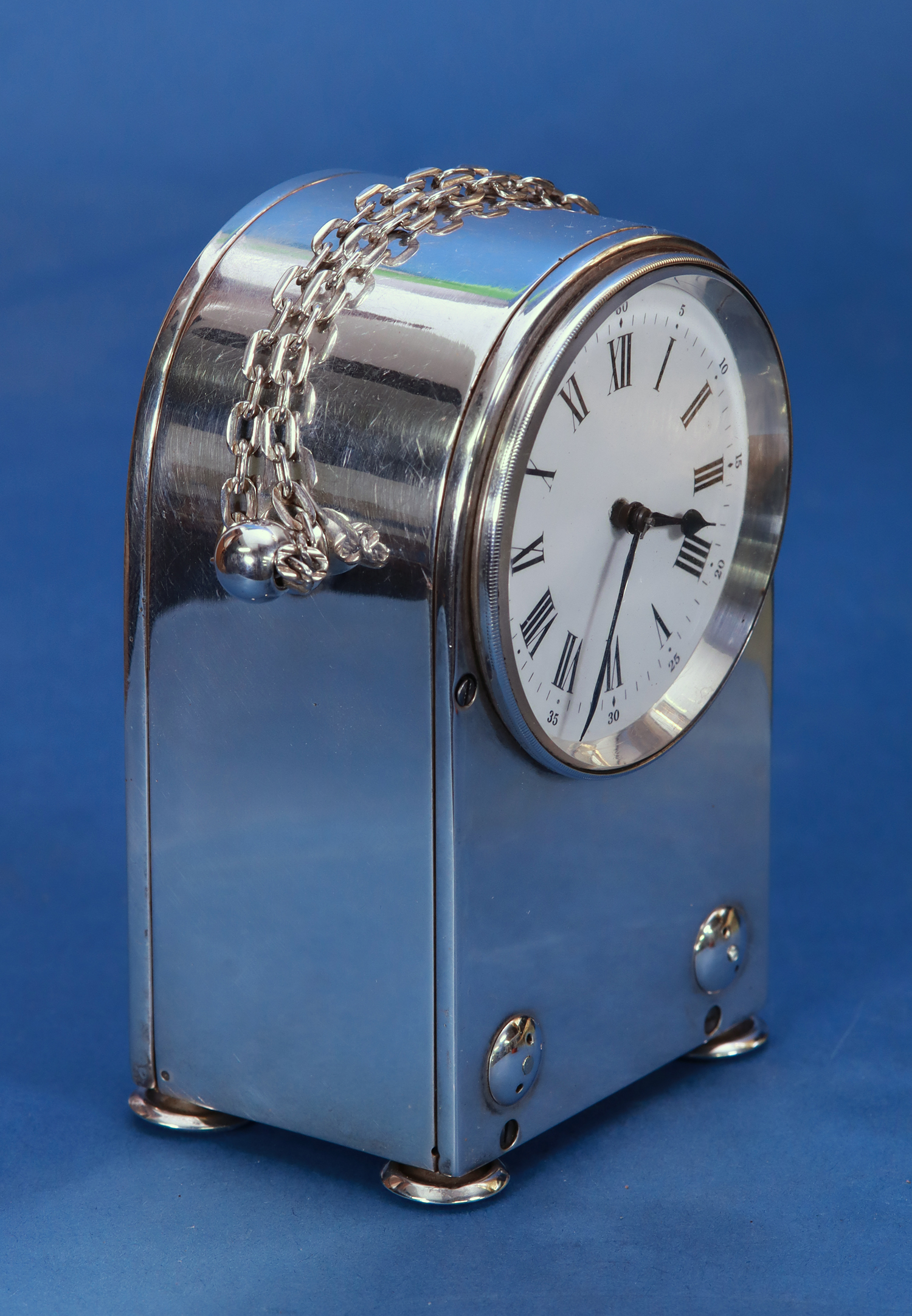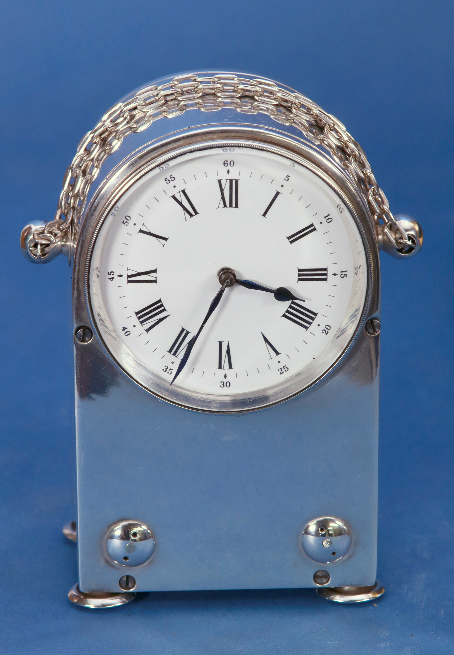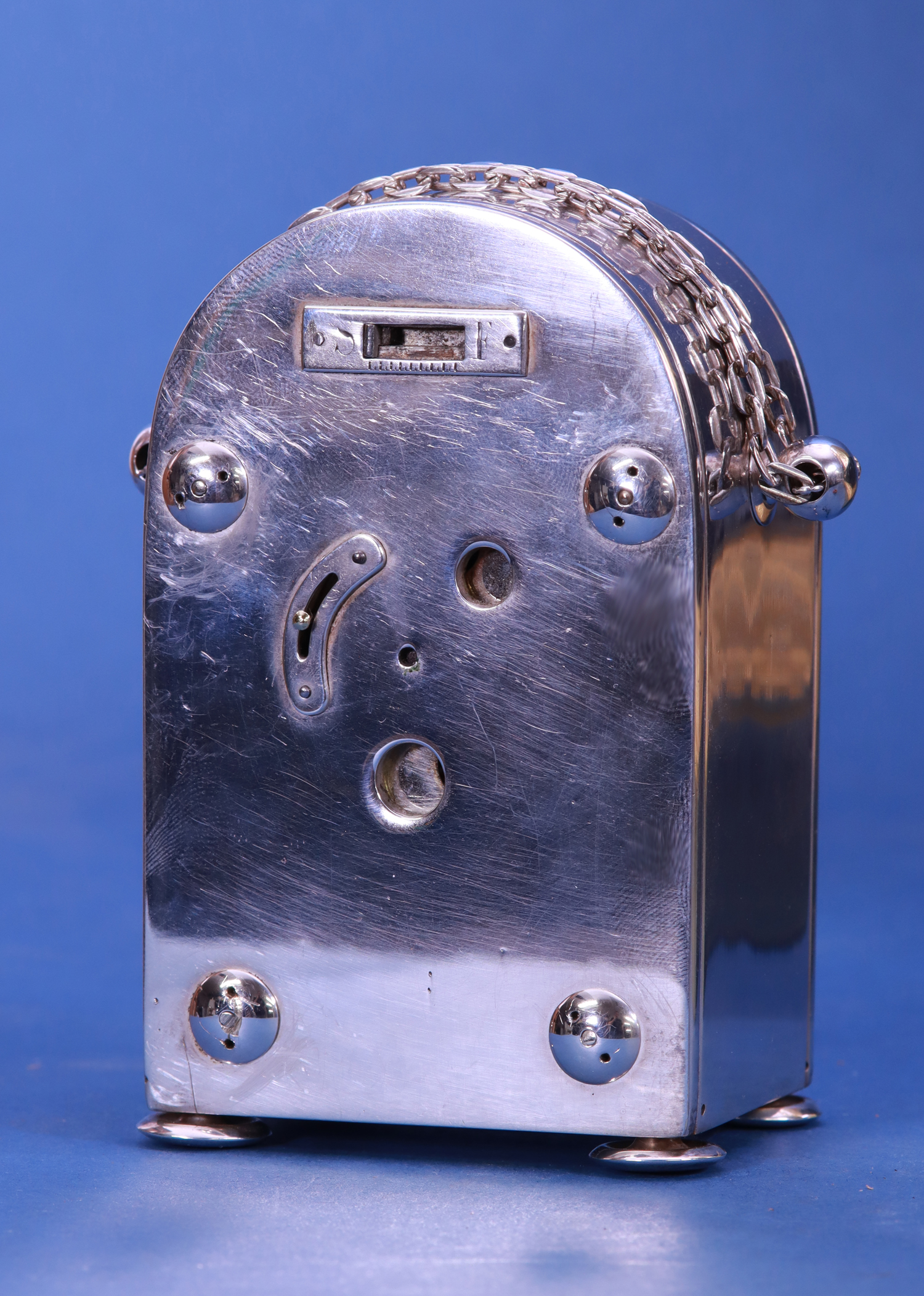 The silvered humpback shaped case has a chain handle, domed screws, bun feet and shutters for the winding, hand-set and fast/slow.