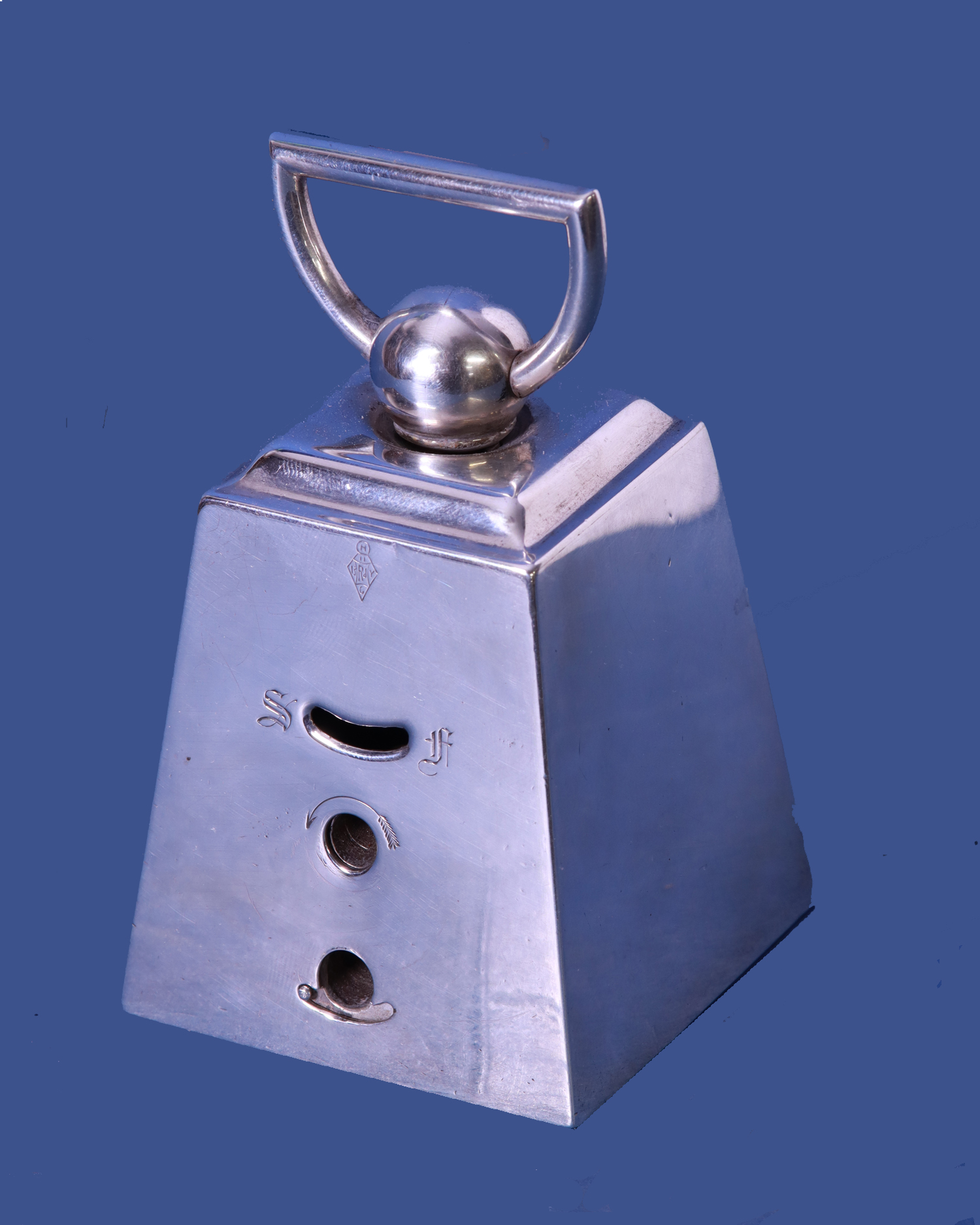 The silver case is shaped like a weight, has a hinged handle and carries a full set of hallmarks.