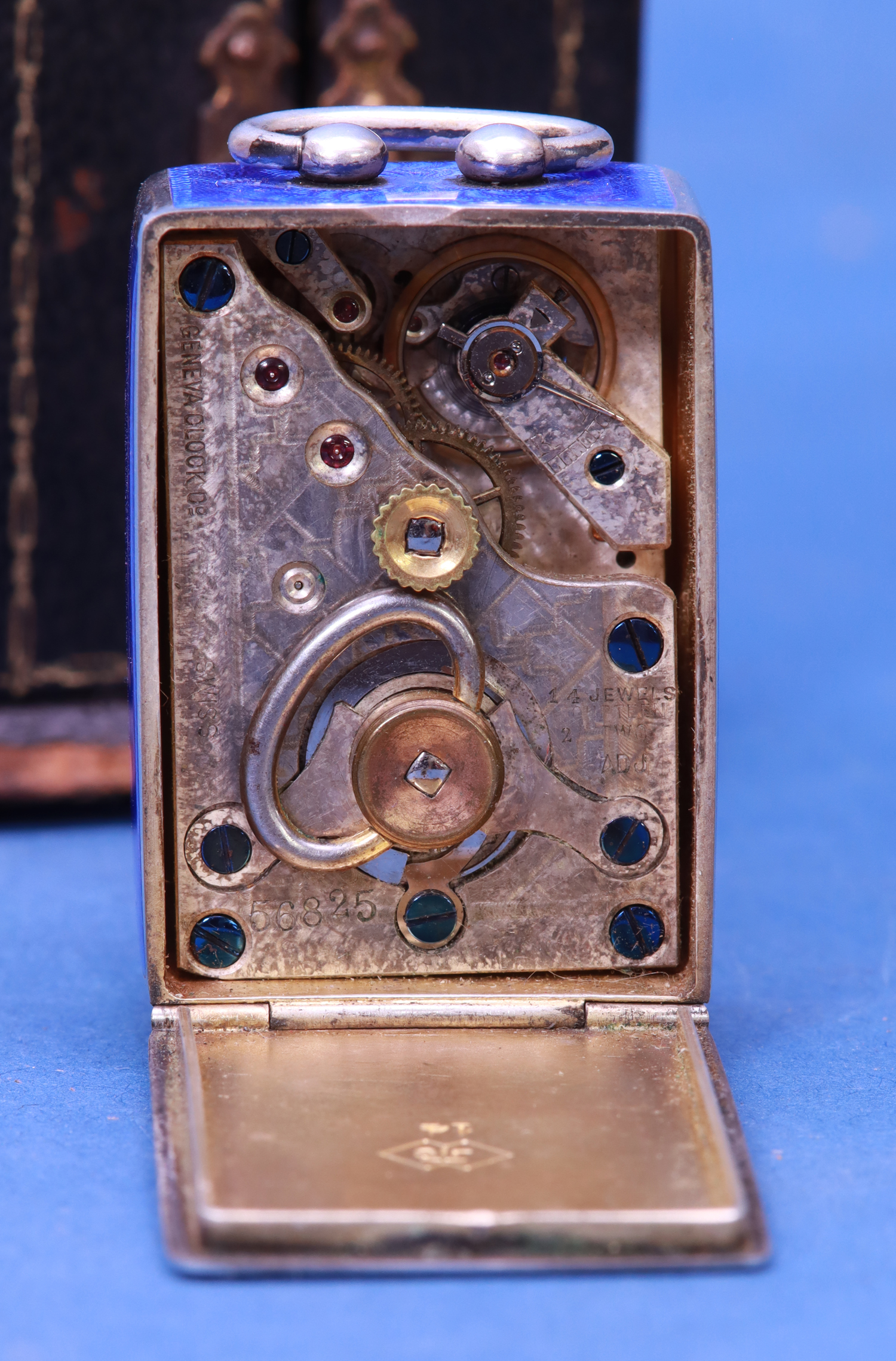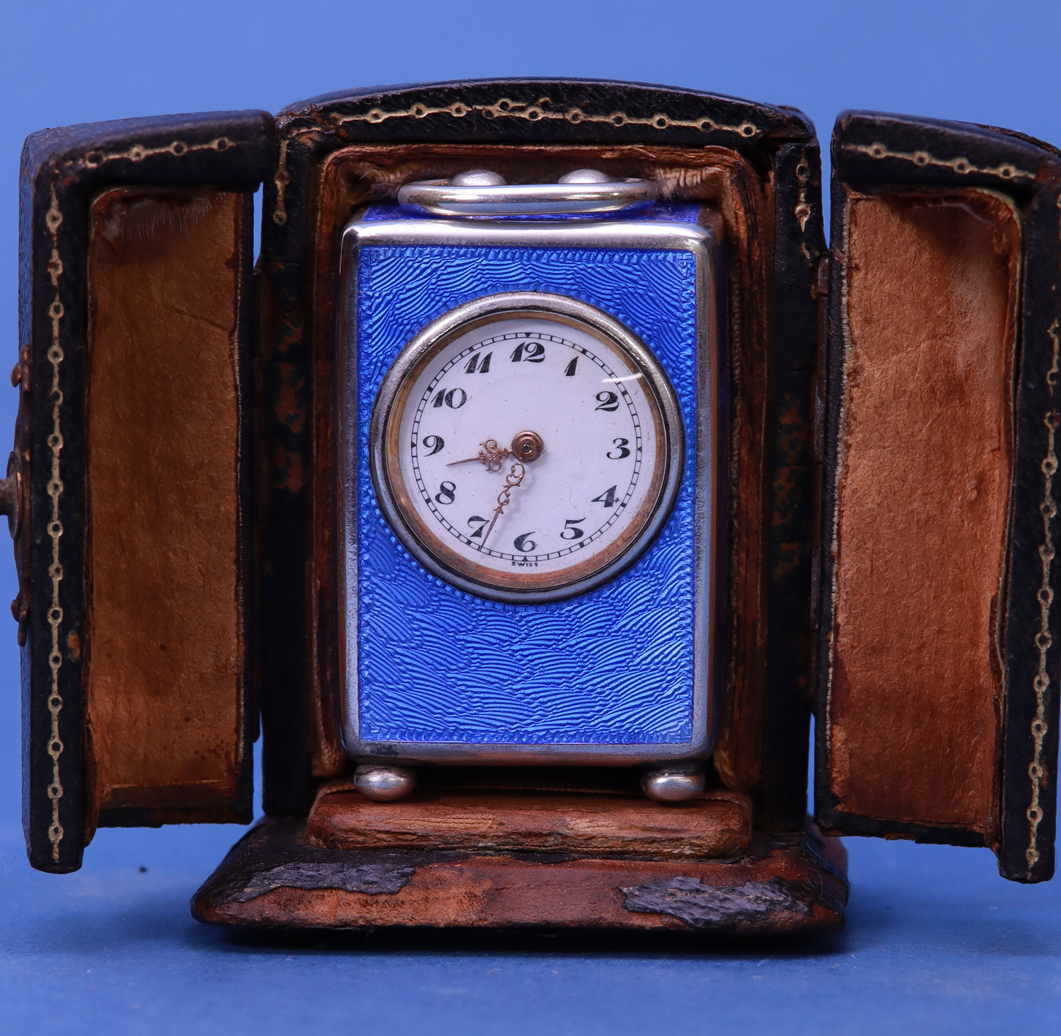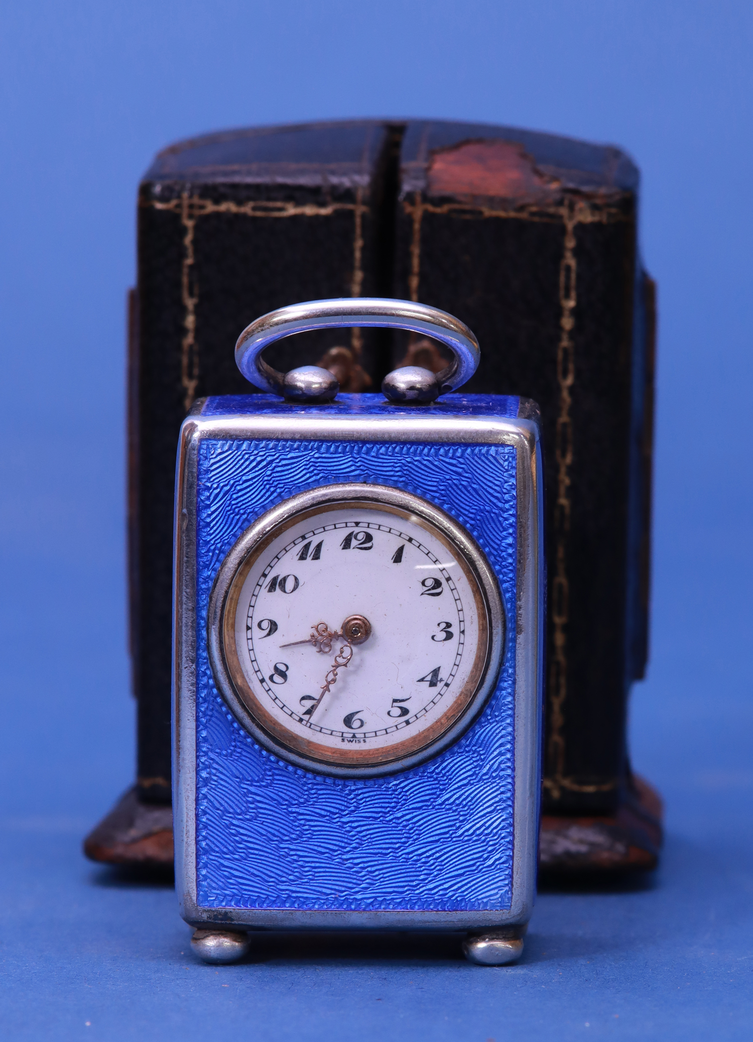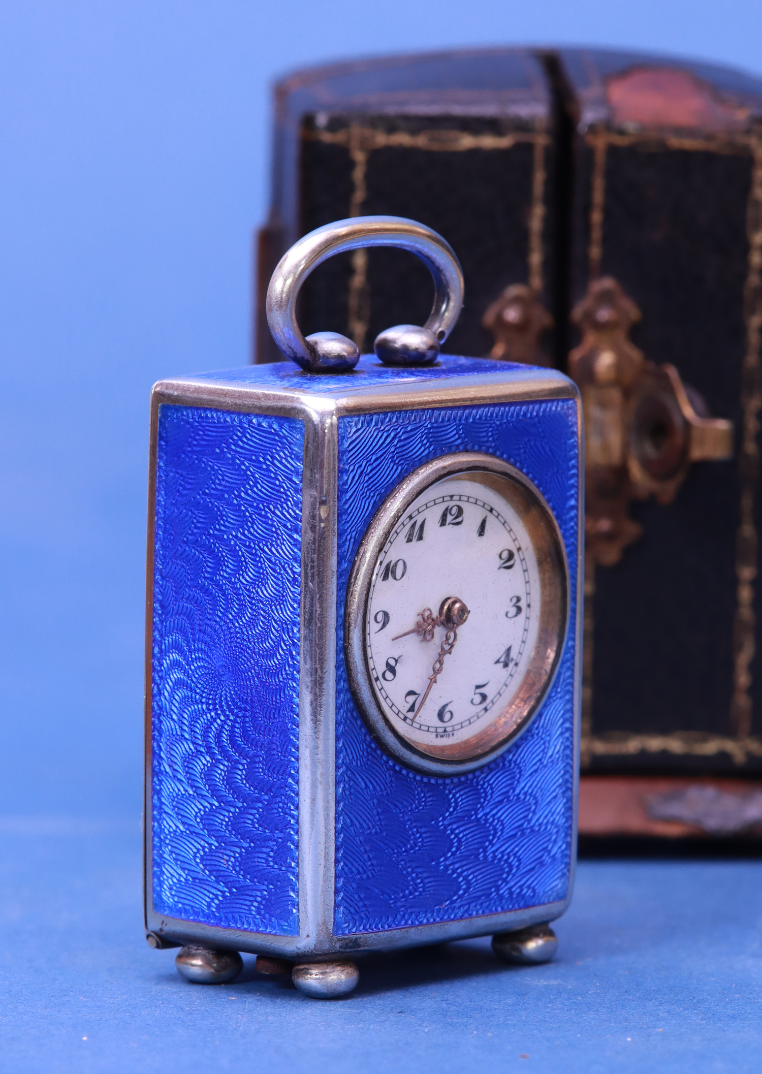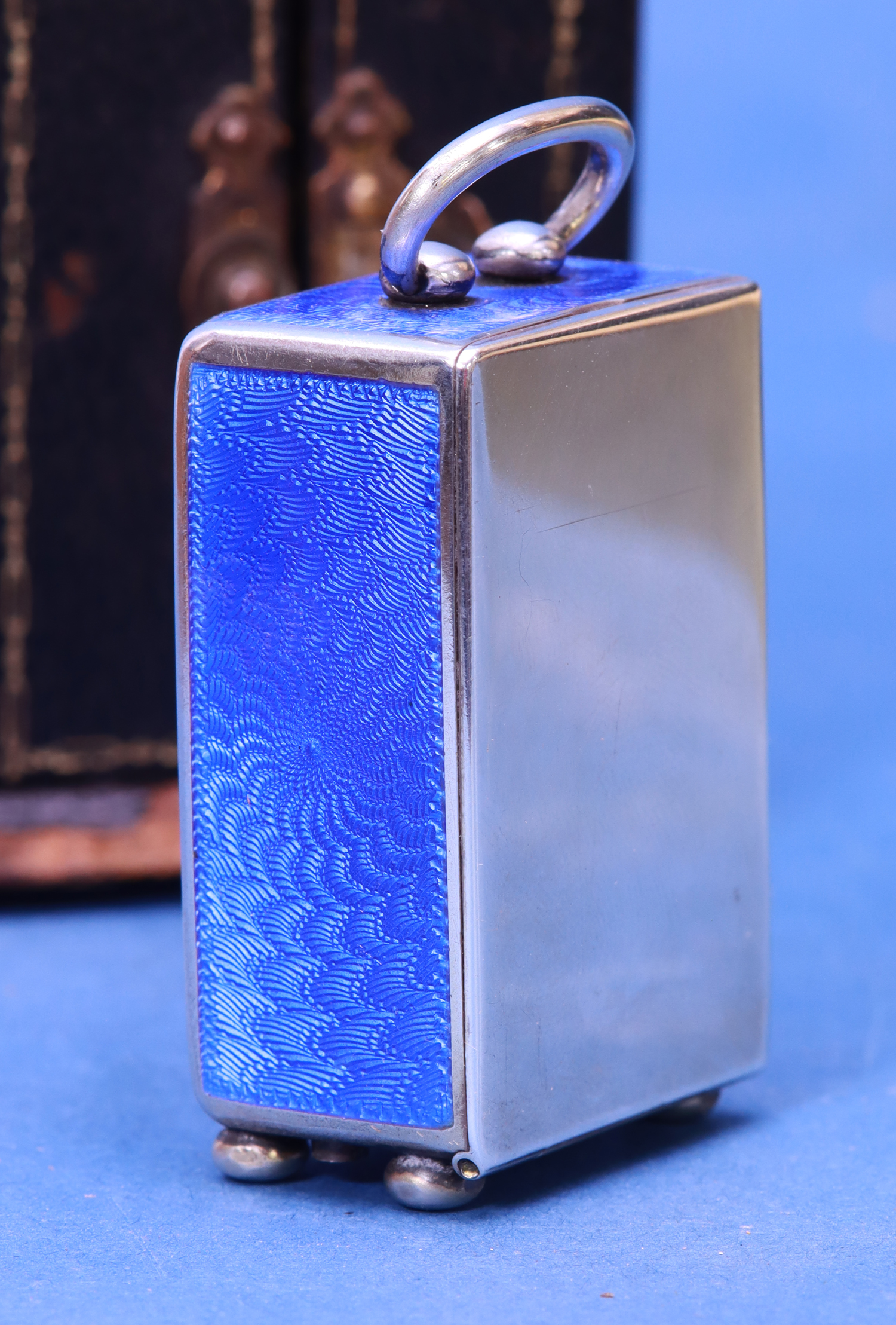 The hallmarked silver case has blue guilloche panels, a silver hinged handle and is stamped on both the hinged back door and bottom. |