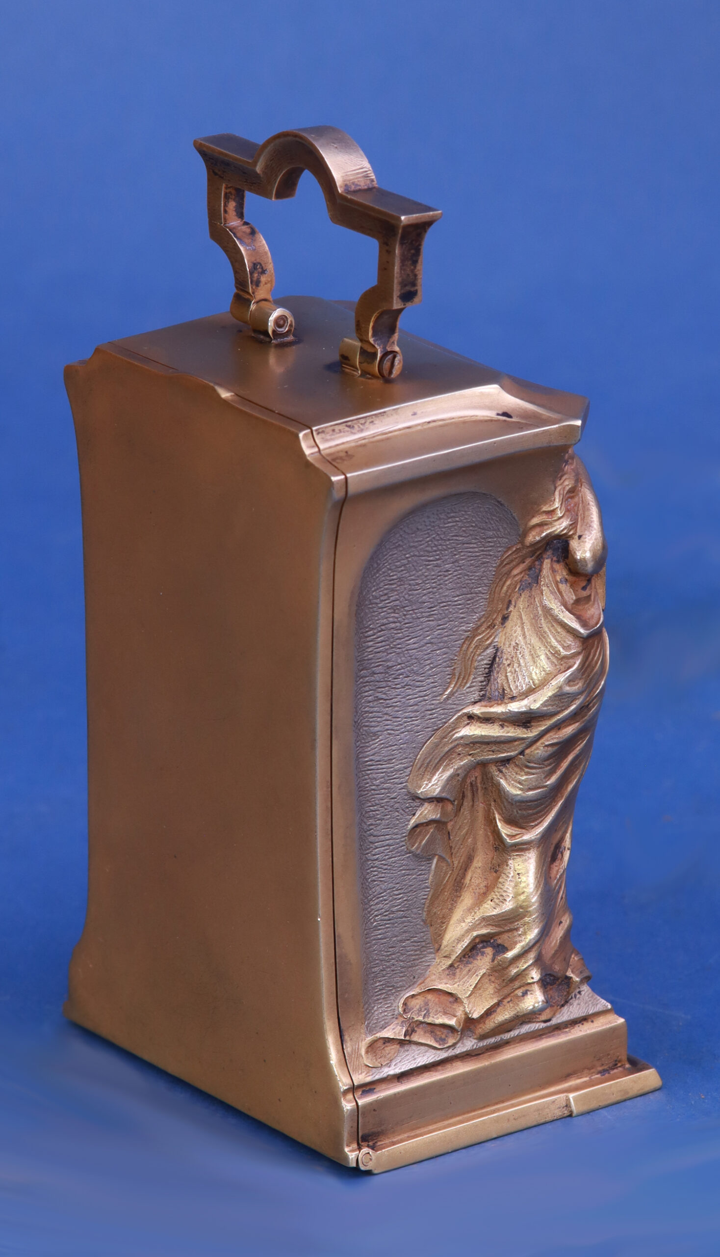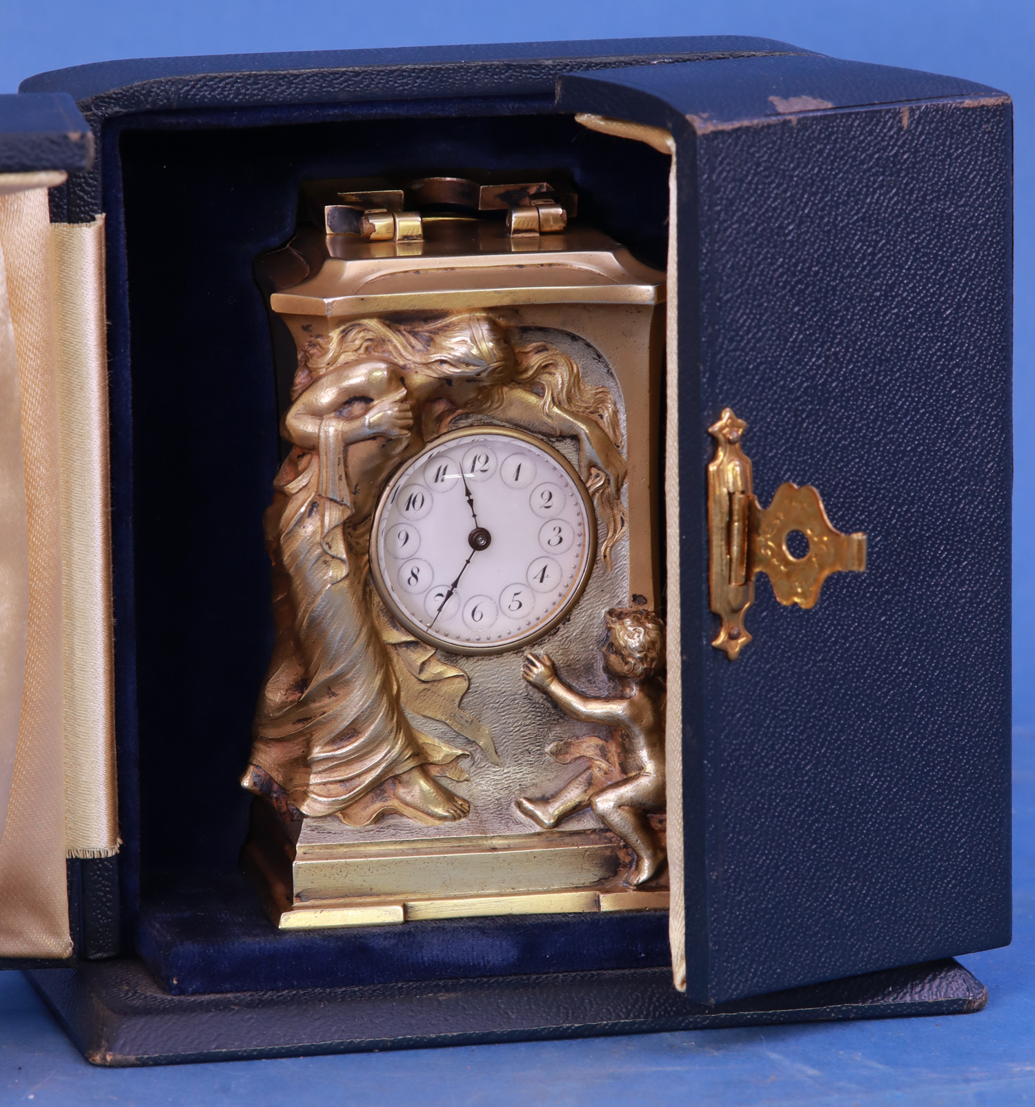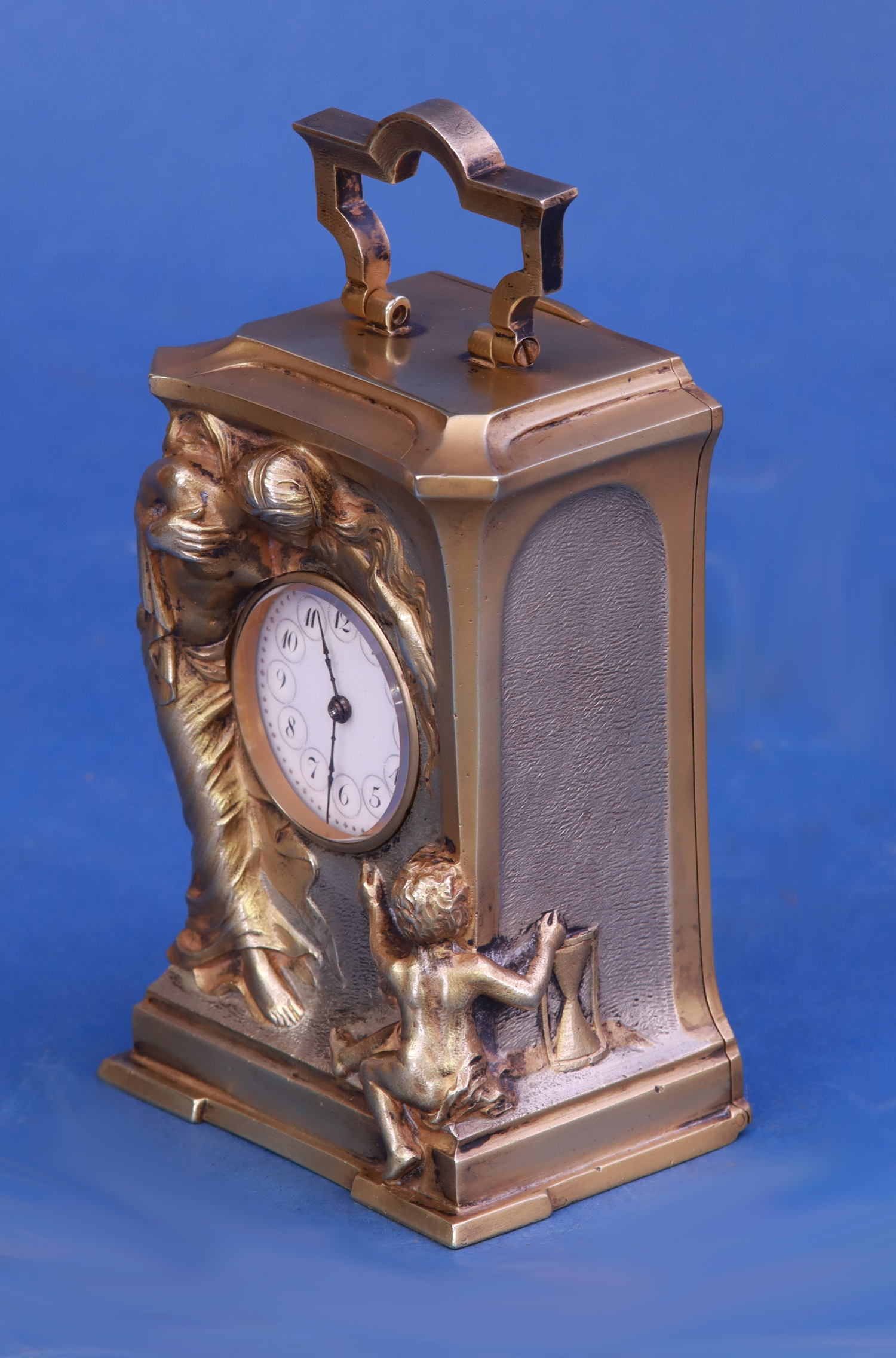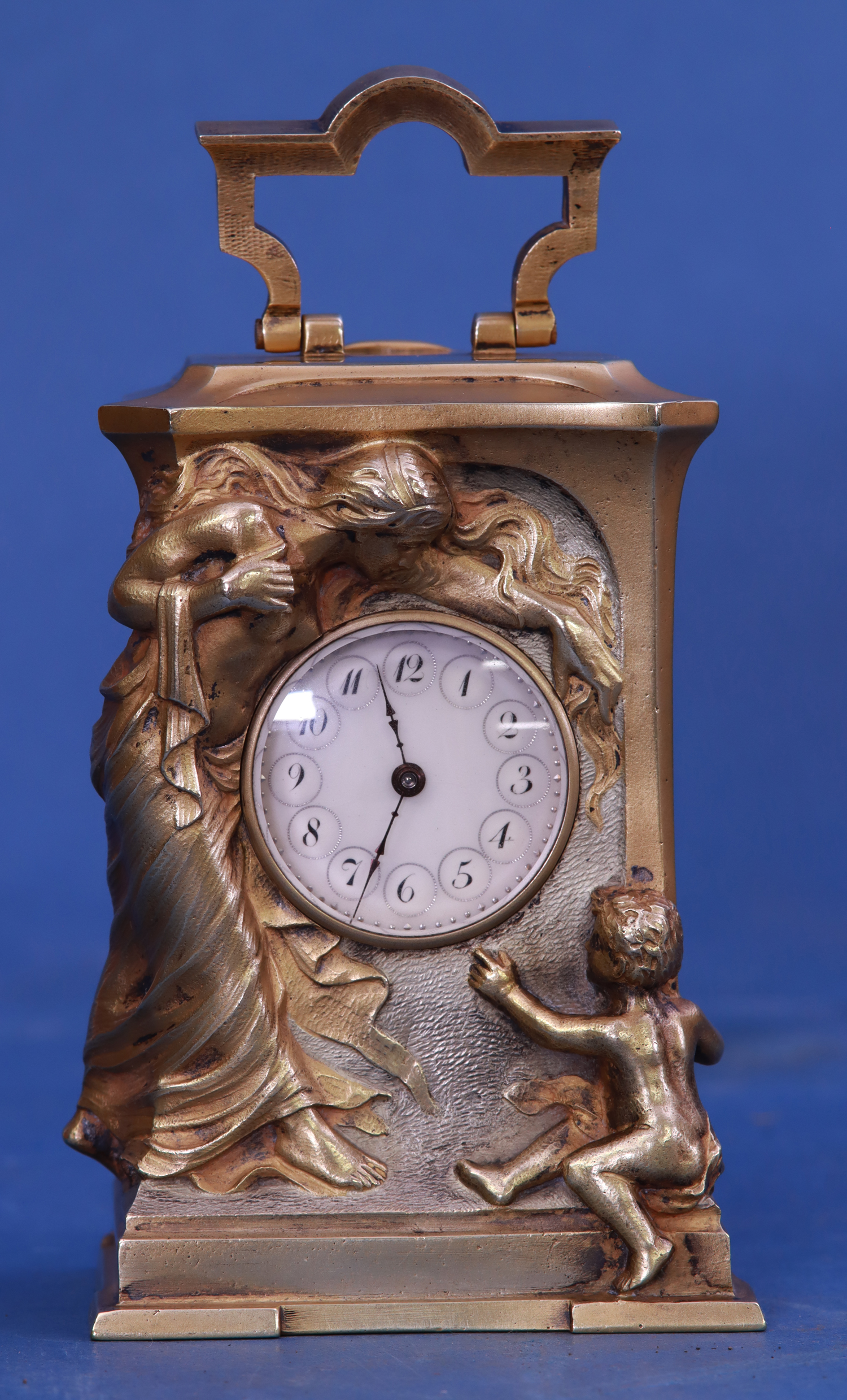 The shaped silvered and gilt-bronze case has a female figure draped around the dial, a cherub below pointing and a hinged handle above.